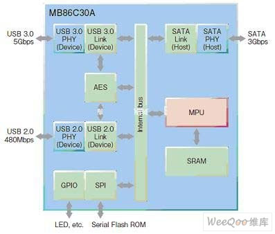 MB86C30A是世界首款USB 3.0从芯片,采用了富士通的高速串行I/O技术。